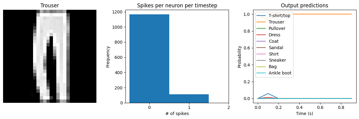 We can see that the model performs similarly to the previous spiking aware training example, which makes sense since, for a static input image, a moving average is very similar to a global average. We would need a more complicated model, with multiple spiking layers or inputs that are changing over time, to really see the benefits of a Lowpass layer. The keras_spiking.Alpha layer is another lowpass-filtering layer, which can provide better filtering of spike