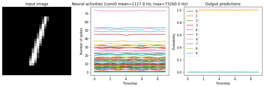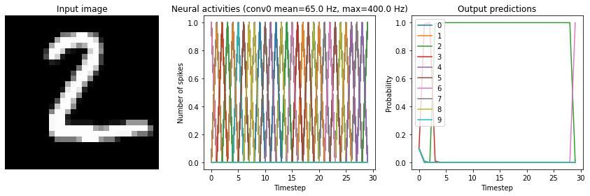Now that we have the non-spiking version working in Nengo, we can start converting the network into spikes. Using the NengoDL converter, we can swap all the relu activation functions to nengo.SpikingRectifiedLinear.